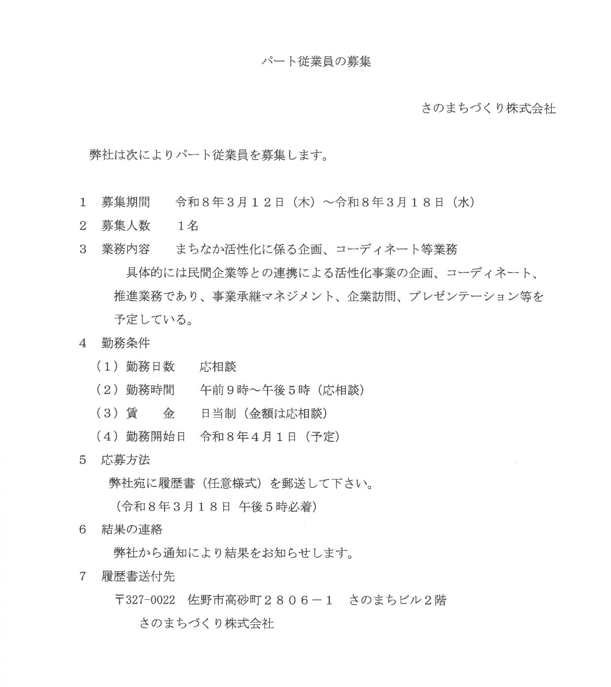 パート従業員の募集について(2026年03月12日)