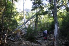大きな岩が真っ二つに割れています。さながら桃太郎岩ですね。 | 沢に沿った急坂の登山道を登って行きます。 |